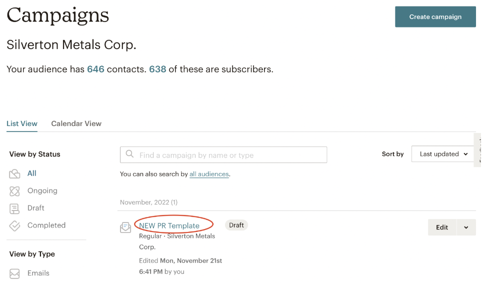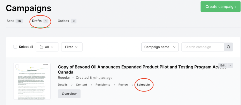 Make sure you’re on the “Drafts” tab then on the drafted e-blast (usually the top one) click on "Schedule".